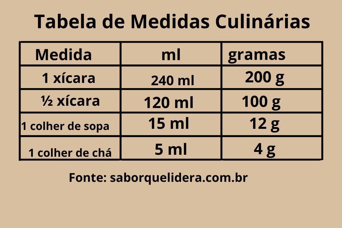 Se você quiser consultar outras conversões utilizadas na culinária, veja também nossa tabela completa de medidas culinárias, onde mostramos equivalências entre xícaras, colheres, ml e gramas utilizadas nas receitas.