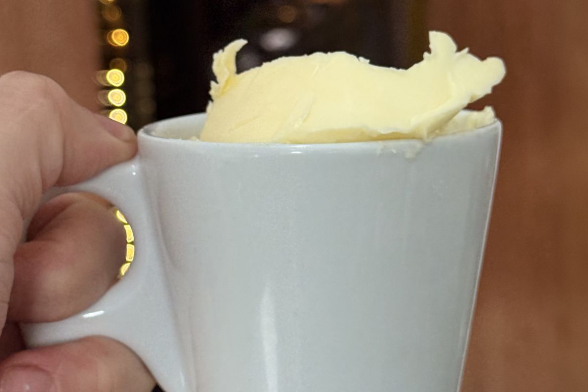 Basta colocar a manteiga na xícara até atingir o volume desejado.